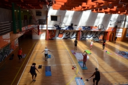 Skupinové cvičení pro seniory. Cvičení nezatěžuje kloubní a kardiovaskulární systém, zahrnuje prvky kalanetiky.